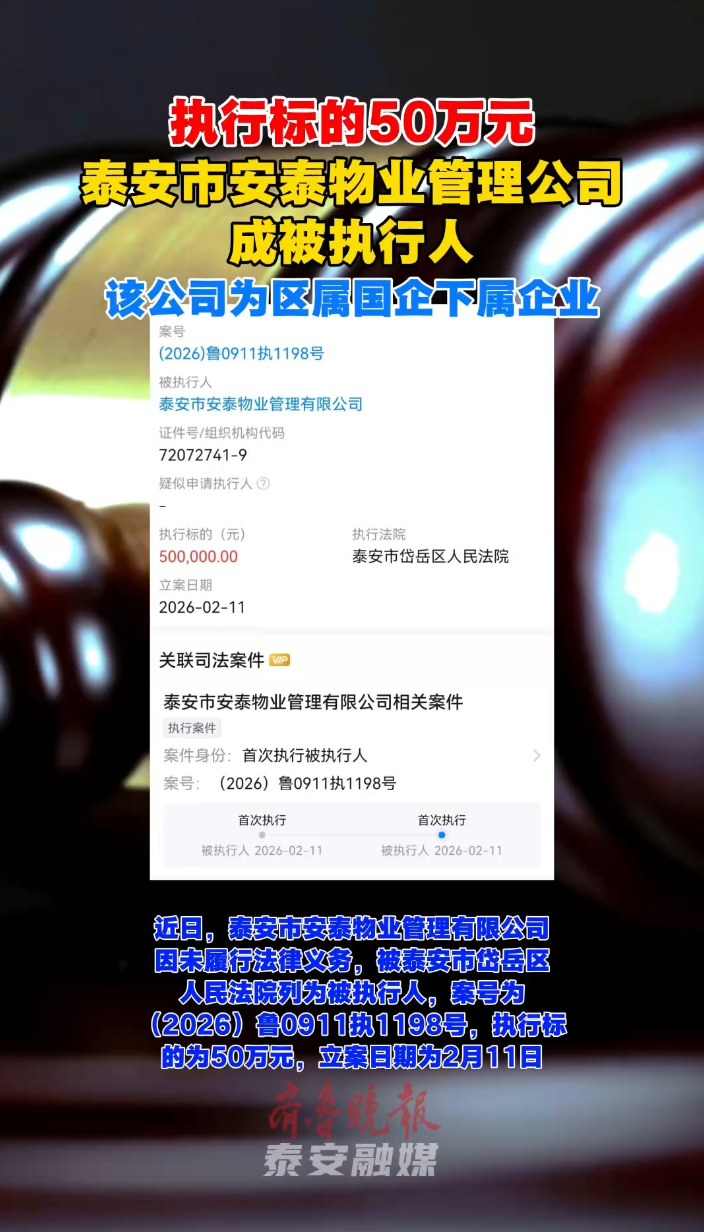 果然视频丨执行标的50万元,泰安市安泰物业管理有限公司成被执行人大众报业·齐鲁壹点 14:39齐鲁晚报•齐鲁壹点 近日,泰安市安泰物业管理有限公司因未履行法律义务,被泰安市岱岳区人民法院列为被执行人,案号为(2026)鲁0911执1198号,执行标的为50万元,立案日期为2026年2月11日。