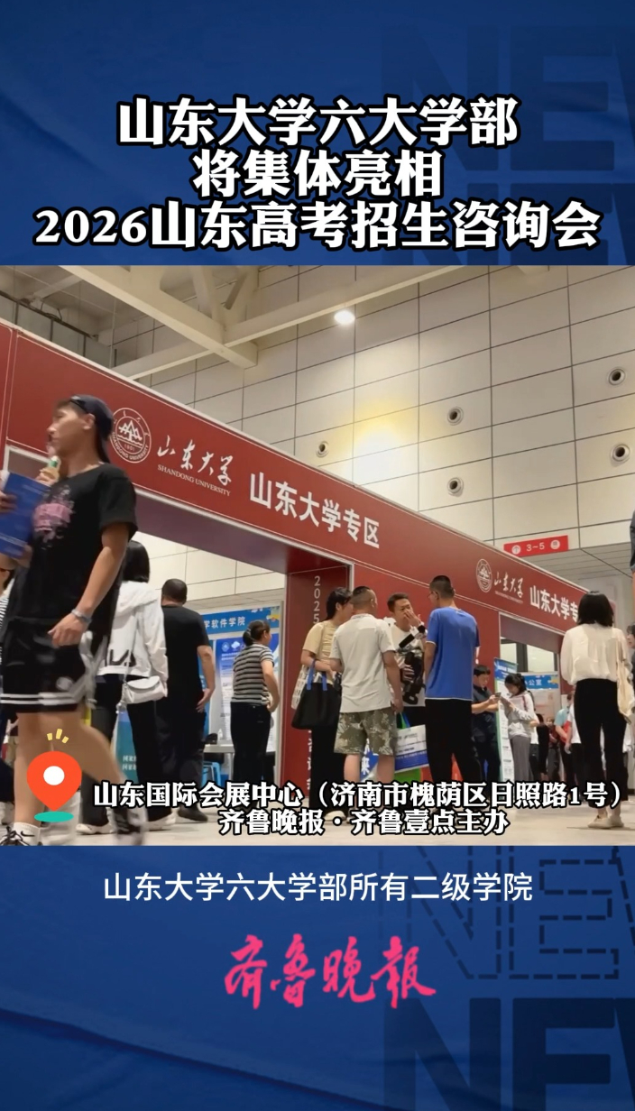 果然视频|山东大学所有二级学院将集体亮相山东高考招生咨询会齐鲁壹点 | 14:48 原创齐鲁晚报·齐鲁壹点客户端 微信扫码扫码下载客户端山东大学六大学部所有二级学院将集体亮相2026年山东高考招生咨询会。2026年山东高考招生咨询会由齐鲁晚报·齐鲁壹点主办,主会场在济南市槐荫区日照路1号山东国际会展中心,6月26日、27日举办本专科综合场,7月18日举办高职(专科)场,今年预计有500余所高校招生负责人在现场接受考生、家长的咨询。 (齐鲁晚报·齐鲁壹点记者 尹明亮)