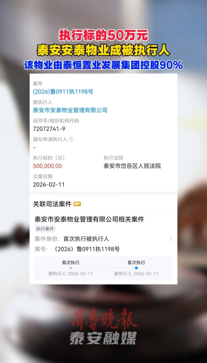 果然视频丨执行标的50万元 泰安安泰物业成被执行人,该物业由泰恒置业发展集团控股90%大众报业·齐鲁壹点 14:39近日,泰安市安泰物业管理有限公司因未履行法律义务,被岱岳区人民法院列为被执行人,案号为(2026)鲁0911执1198号,执行标的为50万元,立案日期为2026年2月11日。