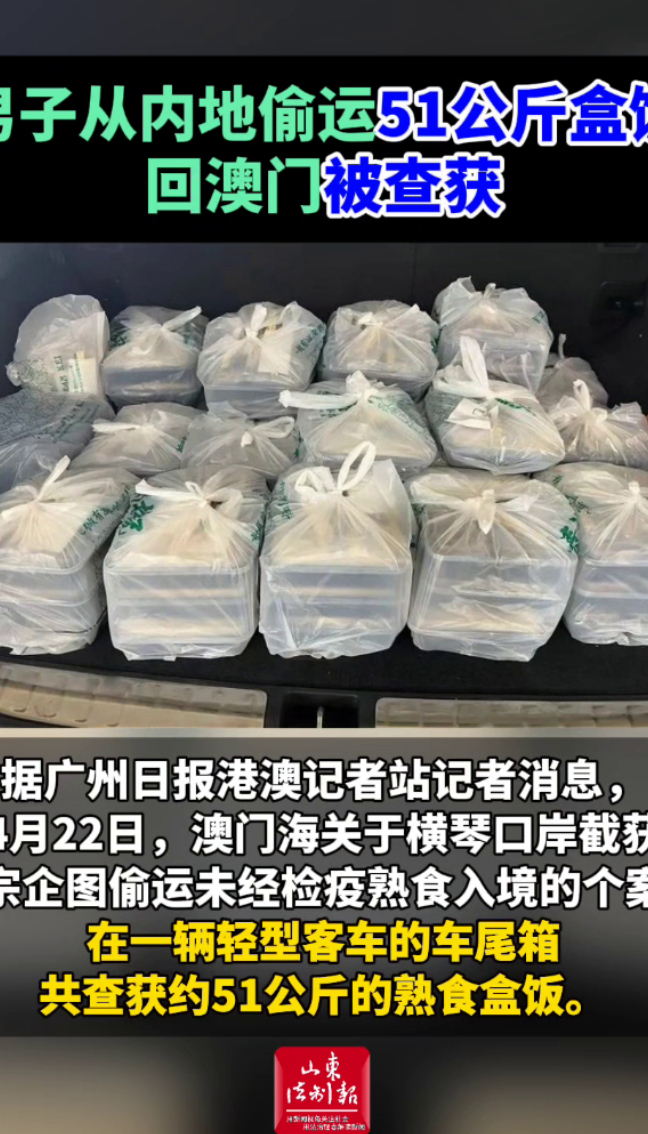据广州日报港澳记者站记者消息,4月22日,澳门海关于横琴口岸截获一宗企图偷运未经检疫熟食入境的个案,在一辆轻型客车的车尾箱共查获约51公斤的熟食盒饭。