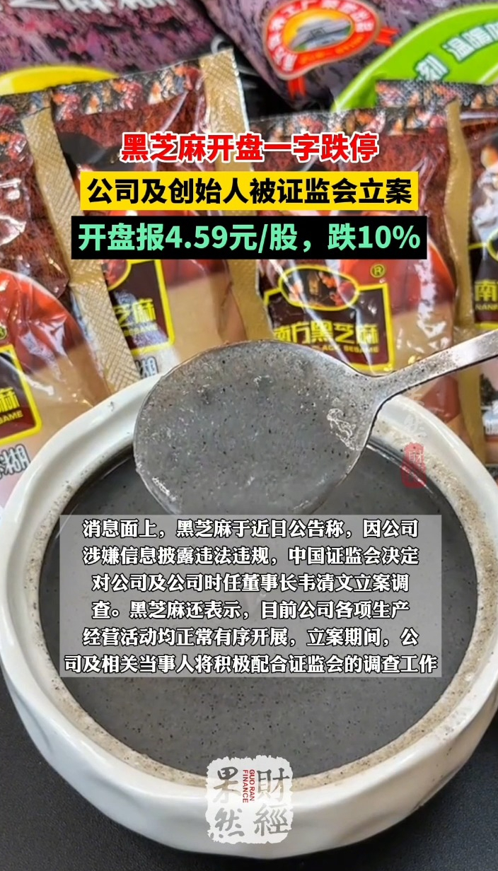 果然财经|黑芝麻开盘一字跌停,公司及创始人被证监会立案 16:09 原创齐鲁晚报·齐鲁壹点客户端 微信扫码扫码下载客户端4月27日,黑芝麻开盘一字跌停。报4.59元/股,跌10%,换手率0.49%,成交额1665万元。消息面上,黑芝麻于近日公告称,因公司涉嫌信息披露违法违规,中国证监会决定对公司及公司时任董事长韦清文立案调查。