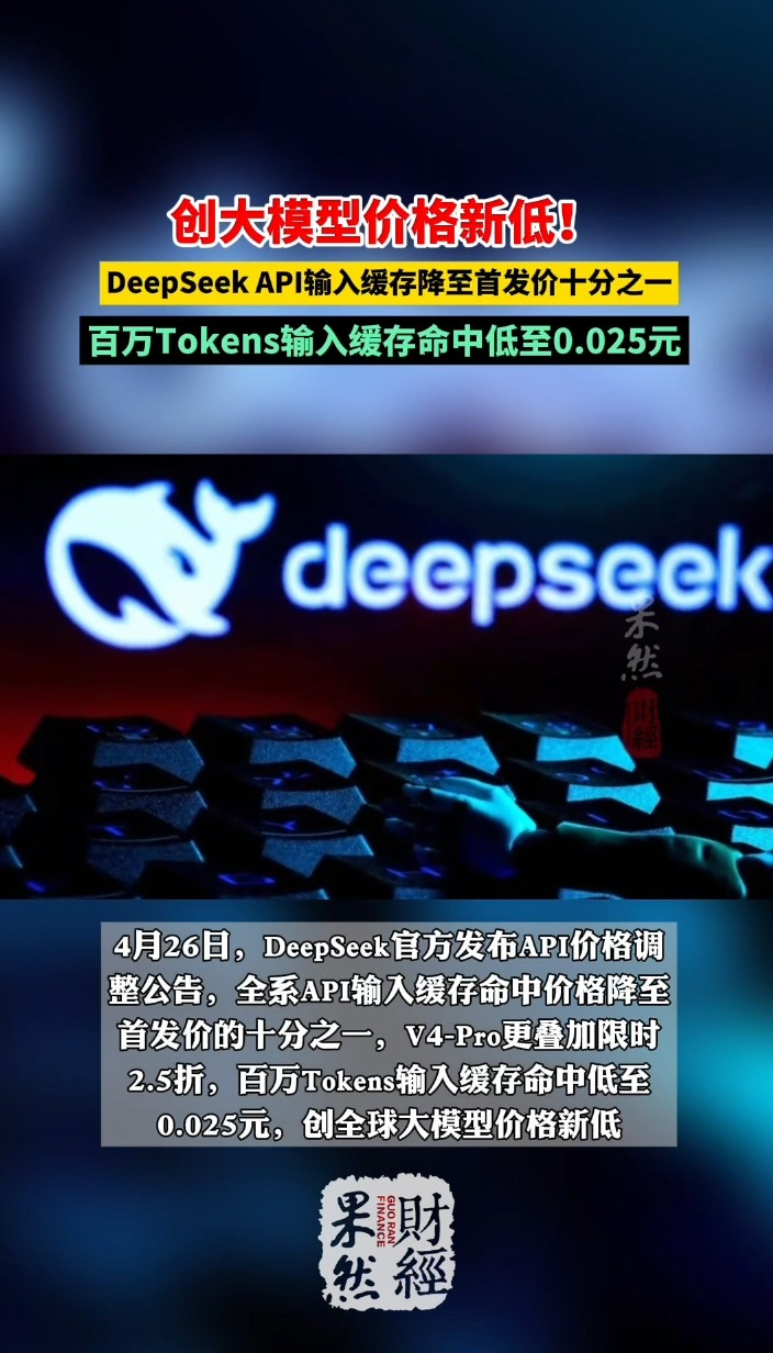 果然财经|创大模型价格新低!API输入缓存降至首发价十分之一 16:09 原创齐鲁晚报·齐鲁壹点客户端 微信扫码扫码下载客户端4月26日,DeepSeek官方发布API价格调整公告,全系API输入缓存命中价格降至首发价的十分之一,V4‑Pro更叠加限时2.5折,百万Tokens输入缓存命中低至0.025元,创全球大模型价格新低。
