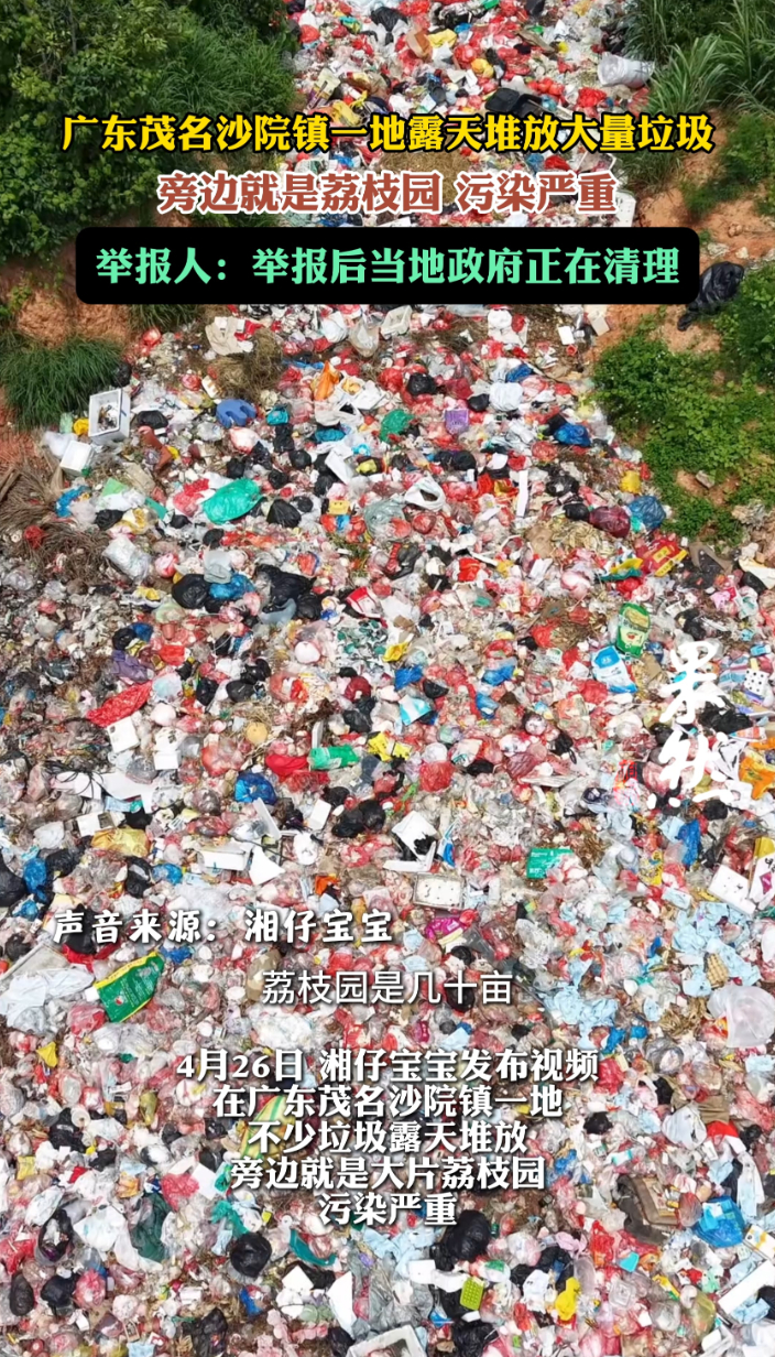 4月26日,湘仔宝宝发布视频,在广东茂名沙院镇,不少垃圾露天堆放,旁边就是大片荔枝园,污染严重。4月27日,记者致电沙院镇政府,工作人员表示不清楚具体情况,“今天领导下乡了。”该工作人员表示。4月27日中午12时,湘仔宝宝告诉记者,今天当地有关部门已经到达现场,正在清理。(爆料电话:0531-85193656;邮箱:405617016@qq.com)(齐鲁晚报·齐鲁壹点 刘志坤 实习生 高文珊)
