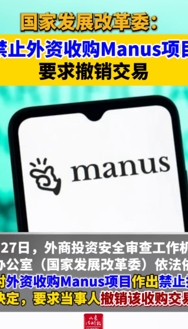 国家发展改革委:禁止外资收购Manus项目 要求撤销交易山东法制报 | 11:56 大众新闻·山东法制报 微信扫码扫码下载客户端4月27日,外商投资安全审查工作机制办公室(国家发展改革委)依法依规对外资收购Manus项目作出禁止投资决定,要求当事人撤销该收购交易。(来源 :央视新闻客户端)