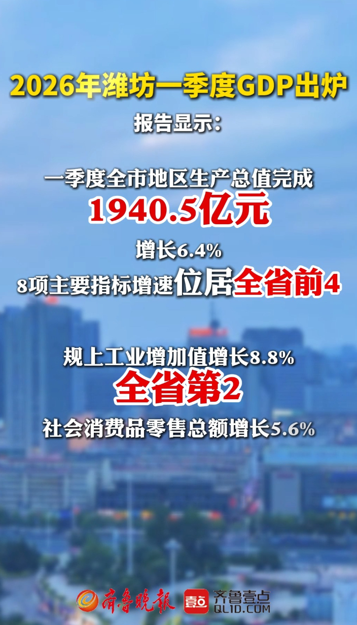 果然视频|2026年潍坊一季度GDP出炉大众报业·齐鲁壹点 09:452026年潍坊一季度GDP出炉,报告显示:一季度全市地区生产总值完成1940.5亿元、增长6.4%,8项主要指标增速位居全省前4。规上工业增加值增长8.8%,全省第2、社会消费品零售总额增长5.6%;一般公共预算收入等8项主要指标增速位居全省前4,工业用电量增长6.7%,高于全省4.1个百分点;37个工业行业大类中有31个实现正增长。
