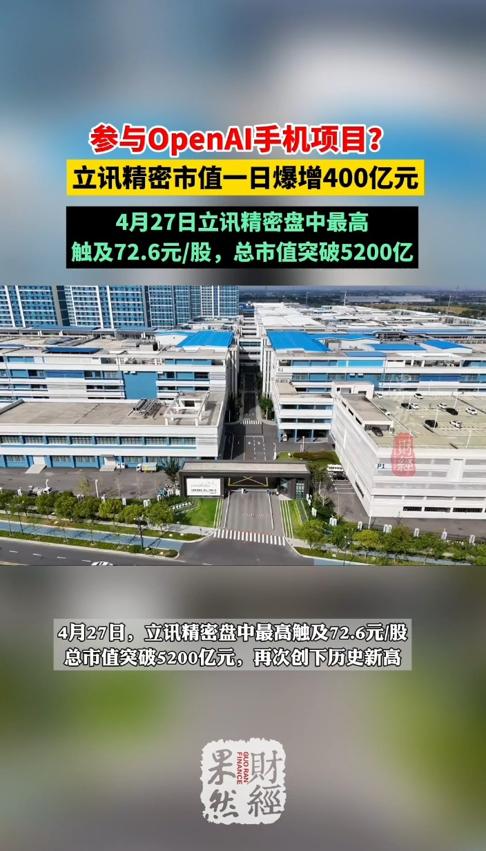 果然财经|参与OpenAI手机项目?立讯精密市值爆增400亿 11:58 原创齐鲁晚报·齐鲁壹点客户端 微信扫码扫码下载客户端日前,记者经产业链调研获悉,立讯精密(002475)确已参与了OpenAI自研AI Agent手机项目,且是该手机的关键零部件供应商和整机制造商。4月27日,立讯精密盘中最高触及72.6元/股,总市值突破5200亿元,再次创下历史新高。