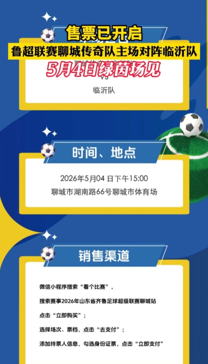 售票已开启!鲁超联赛聊城传奇队主场对阵临沂队,5月4日绿茵场见。(齐鲁晚报·齐鲁壹点 陶春燕)
