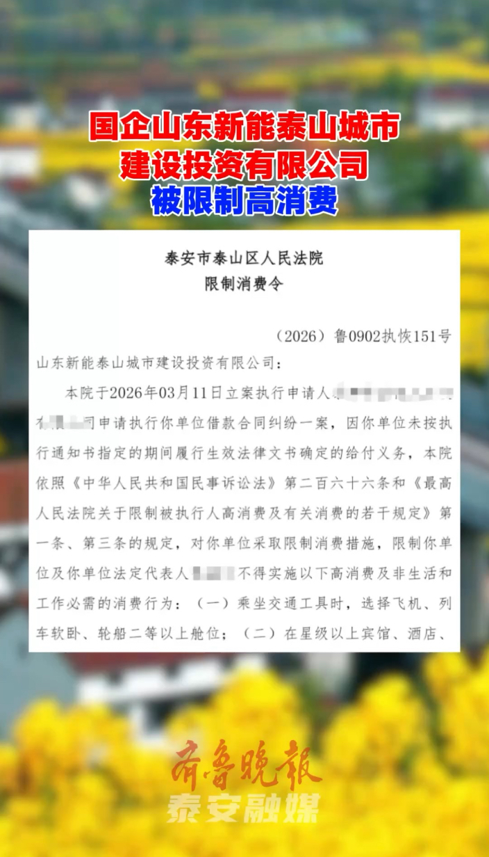 近日,泰山区人民法院发布一则限制消费令,对山东新能泰山城市建设投资有限公司及其法定代表人采取限制消费措施。