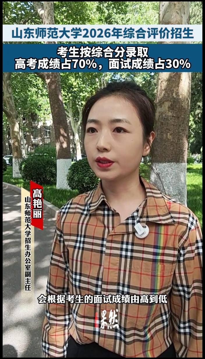 果然视频|山东师范大学2026综合评价招生:考生按综合分录取齐鲁壹点 | 15:13 原创齐鲁晚报·齐鲁壹点客户端 微信扫码扫码下载客户端山东师范大学2026年综合评价招生会根据考生面试成绩由高到低,按照不超过各专业组招生计划数6倍的比例确定入围名单。考生录取是按照考生的综合成绩录取,在综合成绩中,高考总成绩占70%,面试成绩占30%。 综合评价招生是在普通类提前批填报志愿,考生填报的专业志愿必须与获得入围资格的专业组别保持一致。(齐鲁晚报·齐鲁壹点记者 尹明亮)