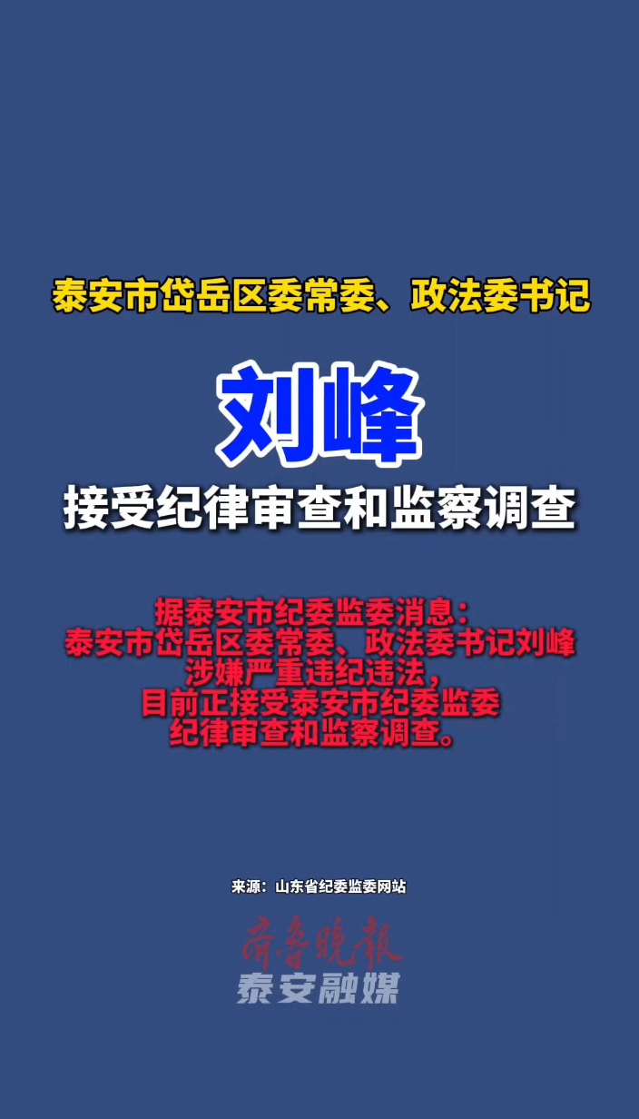 泰安市岱岳区委常委、政法委书记刘峰接受纪律审查和监察调查。