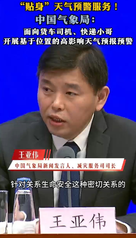 中国气象局新闻发言人、减灾服务司司长王亚伟在会上介绍,针对关系生命安全的气象预警信息发布,要实现广覆盖和精准达。比如,联合相关部门面向货车司机、快递小哥,开展基于位置的高影响天气预报预警,为物流业高效运转做好服务。