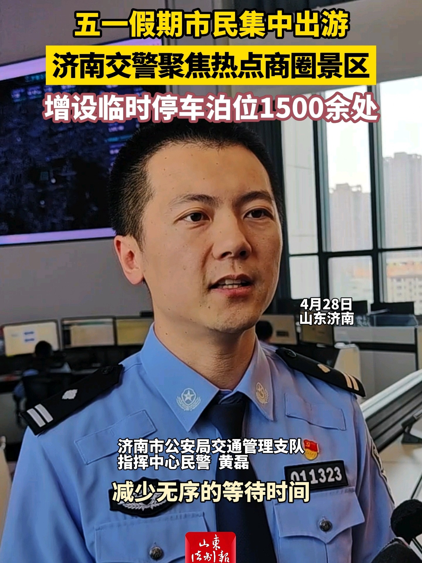 五一假期市民集中出游,济南交警聚焦热点商圈、景区,增设临时停车泊位1500余处 10:26 原创山东法制报 微信扫码扫码下载客户端4月28日,记者从济南市公安局交通管理支队获悉,五一假期将至,市民近郊游、周边游出行需求集中。济南交警聚焦热点商圈、景区,在周边增设临时停车泊位1500余处,并协调济南公交集团加密摆渡运力、增加摆渡车辆,全力保障市民游客顺畅出行。(大众新闻·山东法制报记者 羊文智)