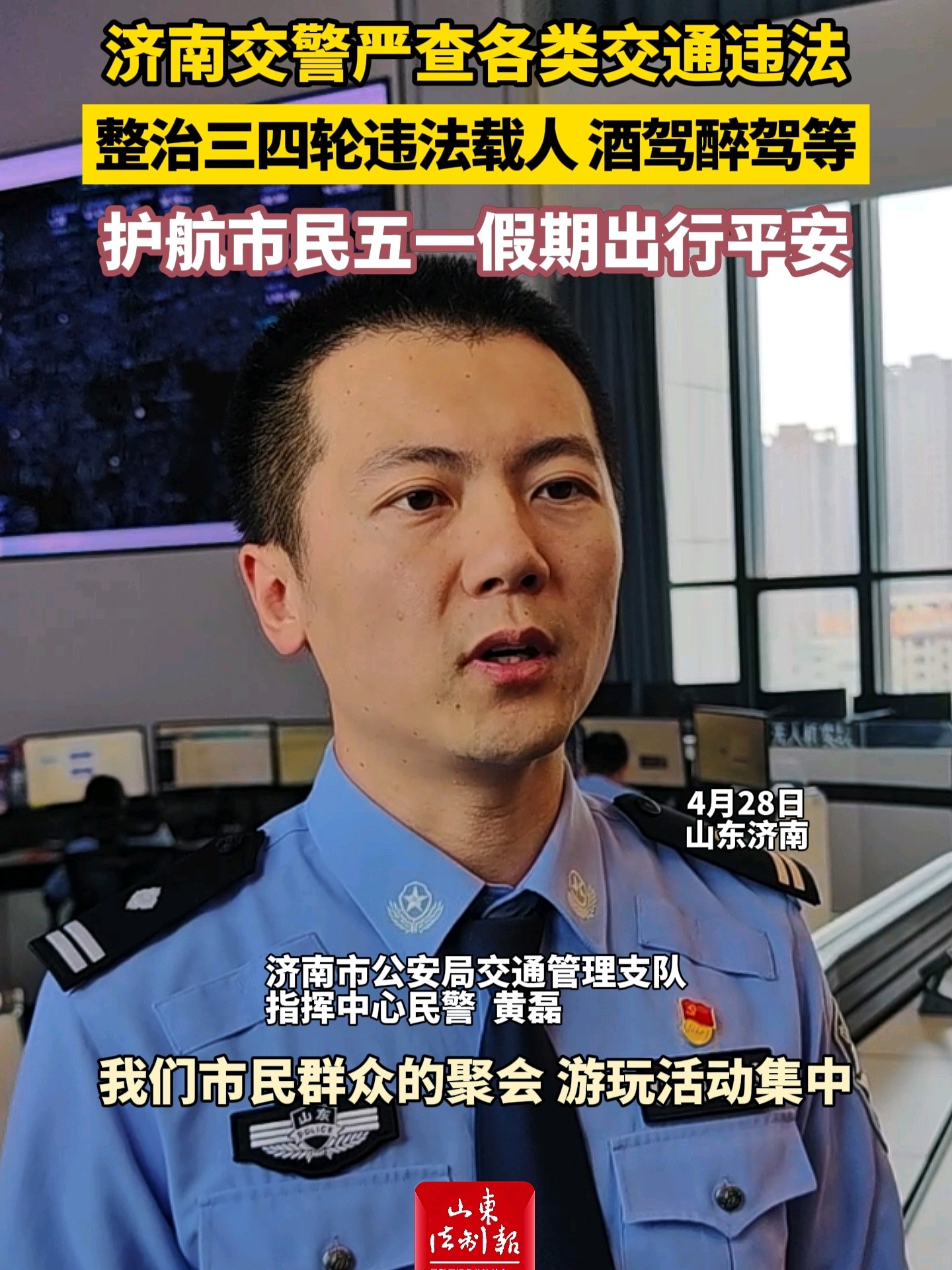 济南交警严查各类交通违法,整治三四轮违法载人、酒驾醉驾等,护航市民五一假期出行平安 10:26 原创山东法制报 微信扫码扫码下载客户端4月28日,记者从济南市公安局交通管理支队获悉,济南交警五一假期将严查各类交通违法行为,聚焦三、四轮车违法载人、酒驾醉驾、违规花车、面包车客车超员超速、疲劳驾驶、“两客一危”、电动车不佩戴安全头盔、无牌无证等突出隐患,持续加大路面查处整治力度,全力守护市民假期出行平安。(大众新闻·山东法制报记者 羊文智)