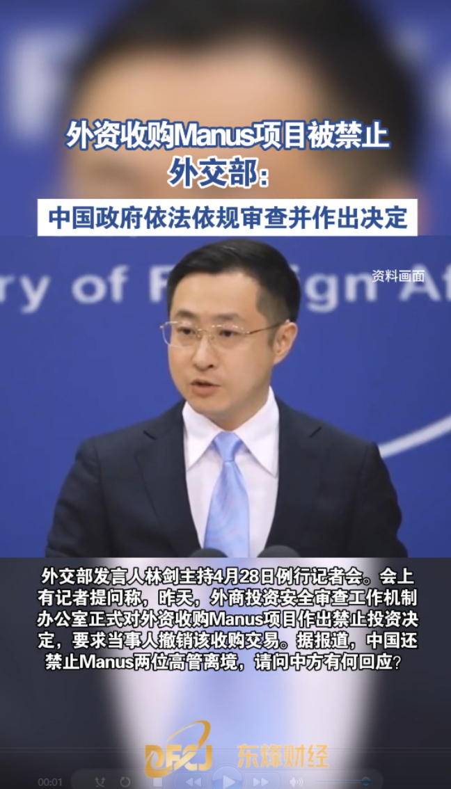 东烽财经丨外资收购Manus项目被禁止,外交部:中国政府依法依规审查并作出决定