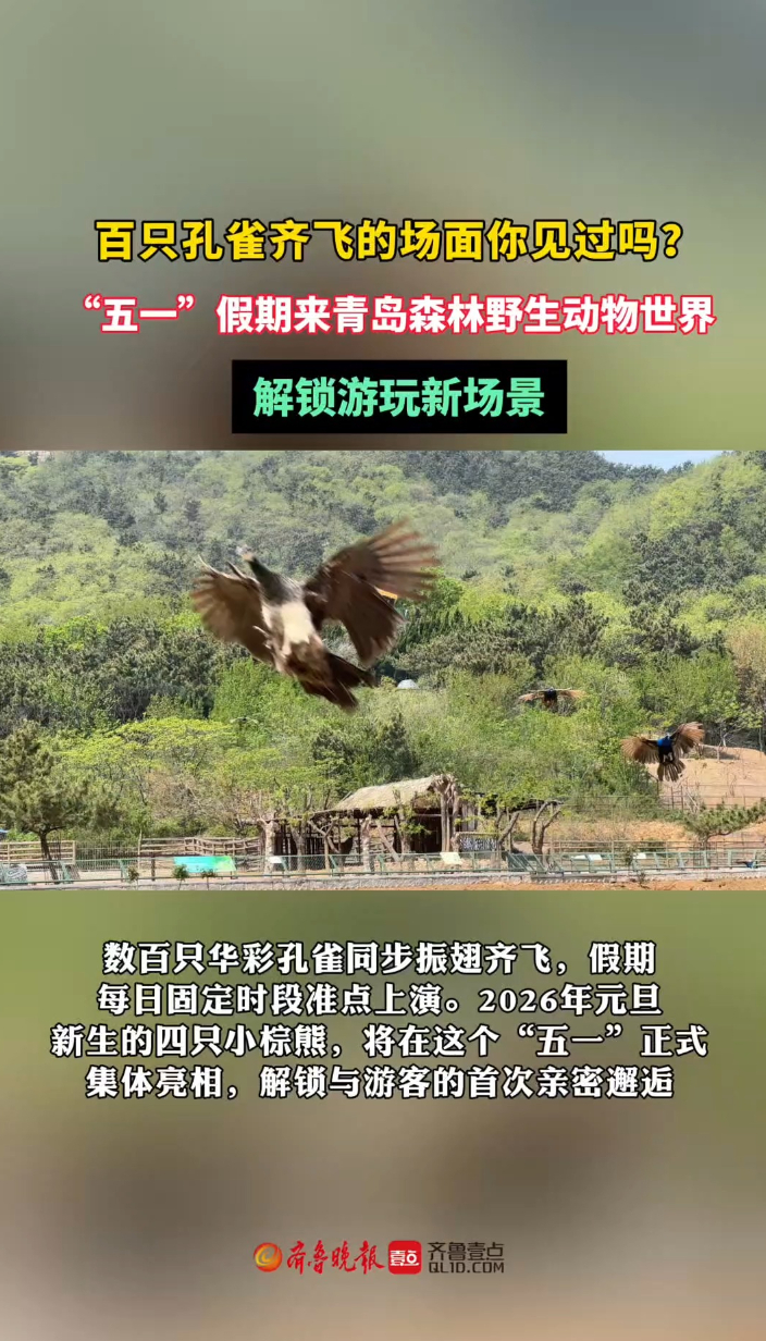 果然视频丨百雀齐飞!“五一”来青岛森林野生动物世界解锁新场景齐鲁晚报·齐鲁壹点客户端 18:41原创今年“五一”假期,青岛森林野生动物世界推出六大特色亮点新场景,以“孔雀放飞”为核心,搭配全新升级展区、萌兽见面会、免费互动体验及露营福利,全方位满足市民游客的假日出游需求。数百只华彩孔雀同步振翅齐飞,假期每日固定时段准点上演。2026年元旦新生的四只小棕熊,将在这个“五一”正式集体亮相,解锁与游客的首次亲密邂逅。 (齐鲁晚报·齐鲁壹点 杨雪)