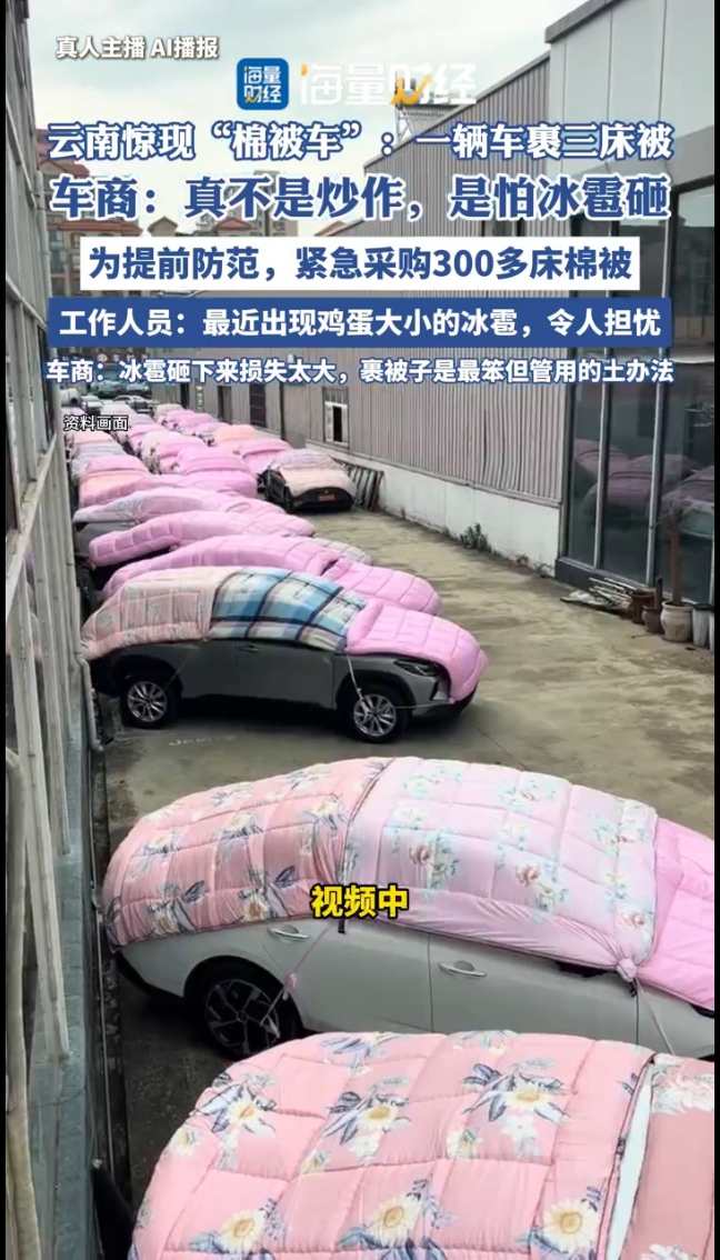 最近云南有句新段子——“云南十九怪,汽车裹着被子卖。”视频中,多辆停放在室外的汽车被棉被包裹。