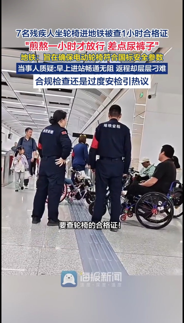西安地铁回应称,检查是为确保电动轮椅符合国标安全参数,且已提供爱心预约服务。