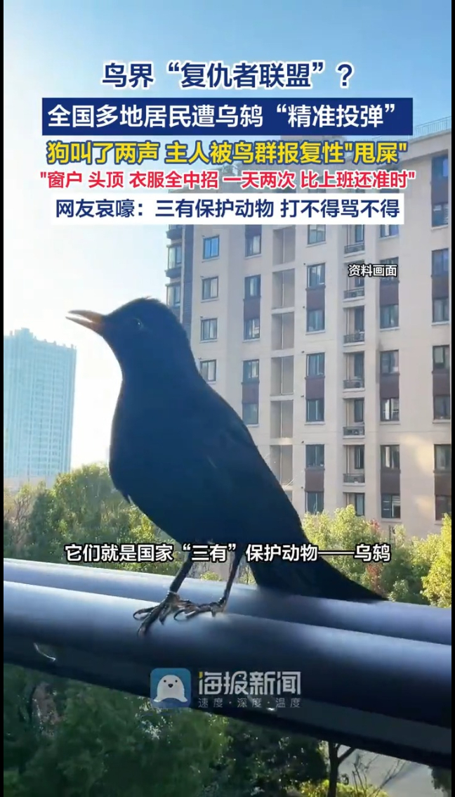 江苏的陈女士家,小狗隔窗叫了一声,鸟夫妻记仇了,一天两次,早上下午准时轮班往窗户上“甩屎”!浙江、安徽市民也接连中招,窗户、衣服、头顶,全被精准投弹。还有位大哥吐槽:一出门鸟就围着骂,虽然听不懂,但感觉挺脏。
