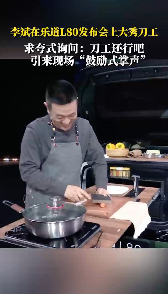 李斌在乐道L80发布会上大秀刀工,求夸式询问:刀工还行吧,引来现场“鼓励式掌声”。#李斌发布会现场遛狗切菜铺床