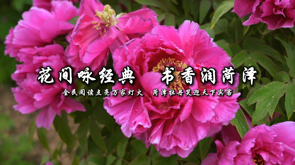 花间咏经典 书香润菏泽 —全民阅读点亮万家灯火、菏泽牡丹笑迎天下宾客。