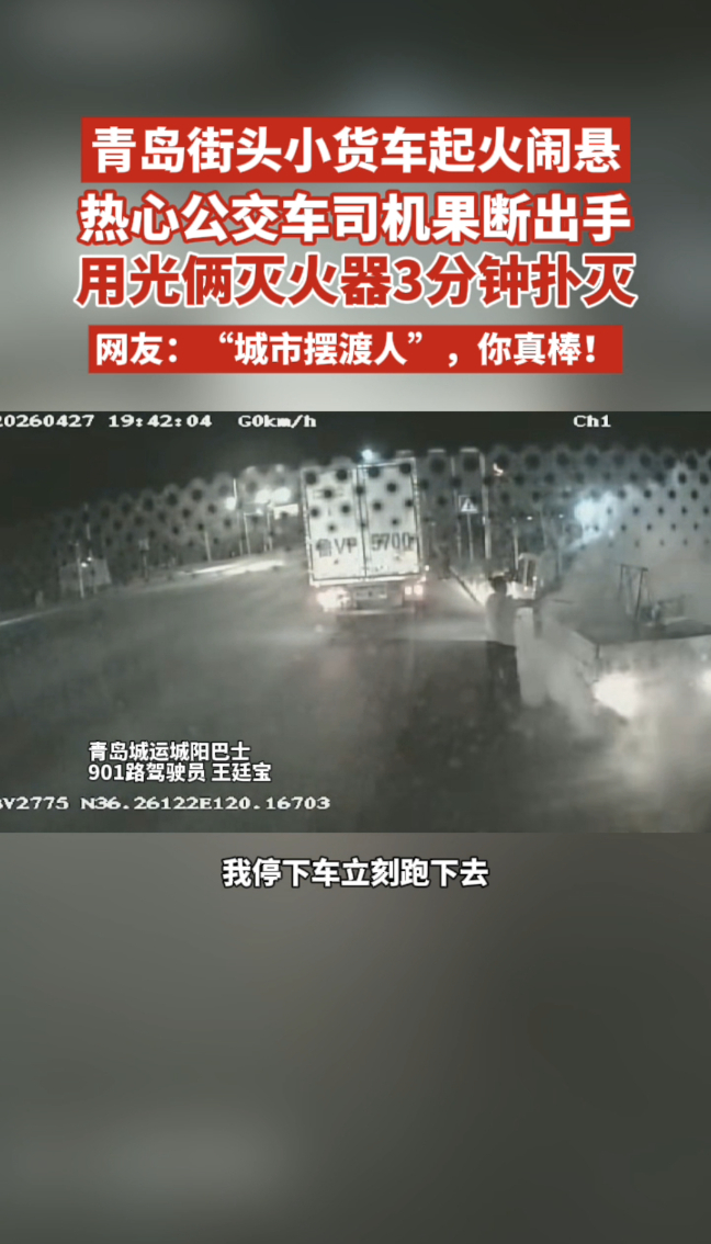 路遇小货车起火闹悬,公交司机拎俩灭火器急速冲刺,仅三分钟灭火