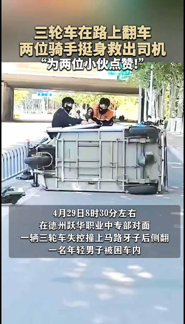 4月29日,在德州市区,一辆三轮车失控翻车,司机被困,两位外卖骑手挺身而出将其救出。(奏嘛新闻记者 常春峰 大众新闻记者 张海峰 )