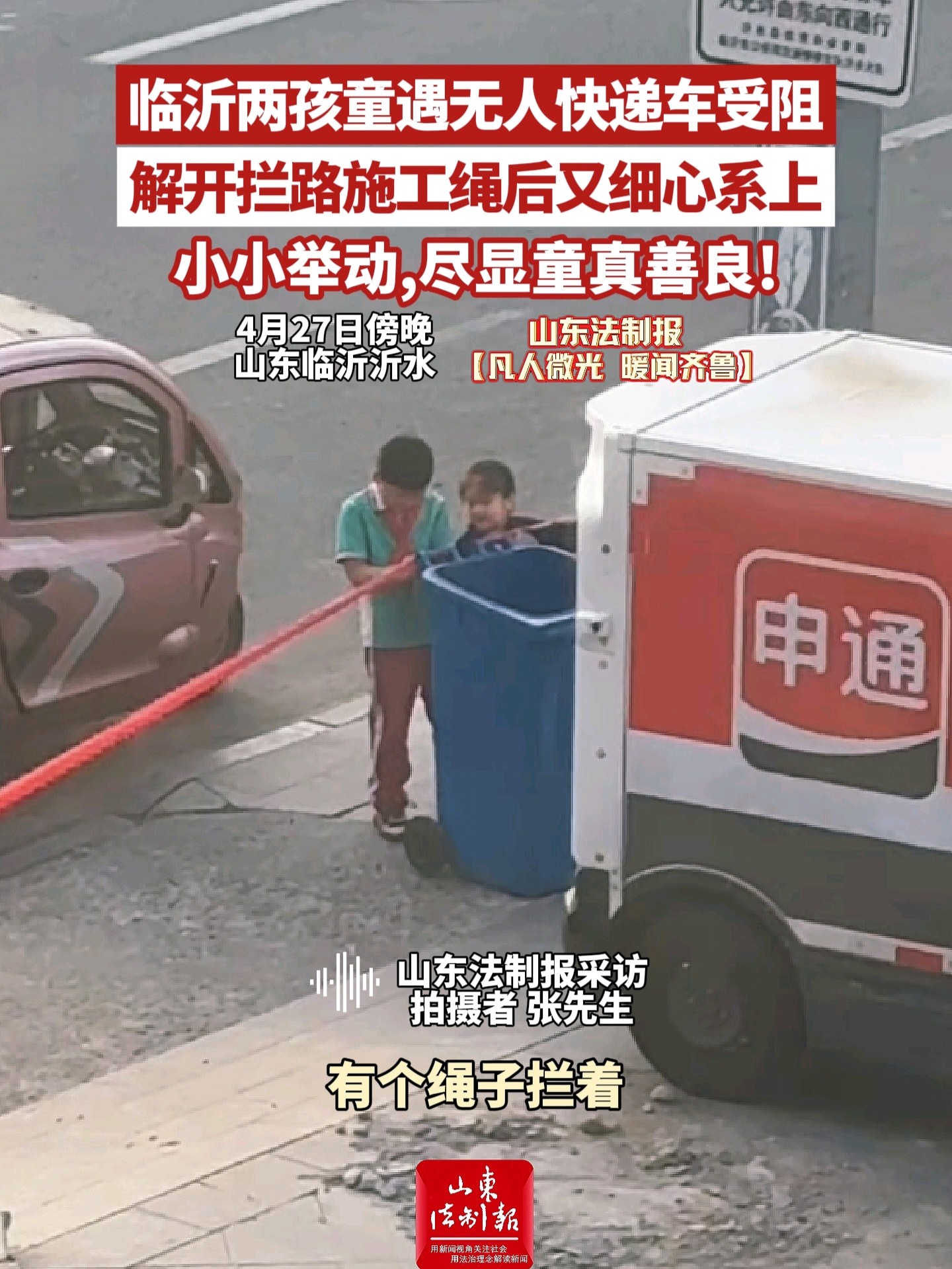 临沂两孩童遇无人快递车受阻,解开拦路施工绳后又细心系上,小小举动,尽显童真善良! 16:46 原创山东法制报 微信扫码扫码下载客户端4月27日傍晚,临沂沂水一辆无人快递车在小区附近被施工绳索拦住。两名孩童见状上前解绳开路,为无人快递车放行,随后细心将绳子复原系好。小小举动,尽显童真善良!(大众新闻·山东法制报记者 羊文智)