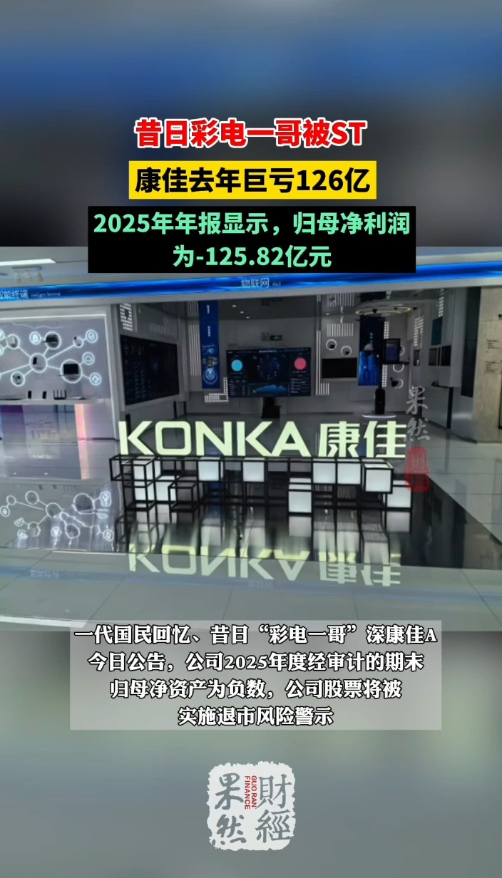果然财经|昔日彩电一哥被ST,康佳去年巨亏126亿齐鲁壹点 | 15:49 原创齐鲁晚报·齐鲁壹点客户端 微信扫码扫码下载客户端一代国民回忆、昔日“彩电一哥”深康佳A今日公告,公司2025年度经审计的期末归母净资产为负数,公司股票将被实施退市风险警示。