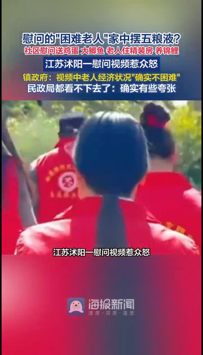 社区慰问送鸡蛋,大鲫鱼,老人住精装房,养锦鲤,摆五粮液?江苏沭阳一慰问视频惹众怒