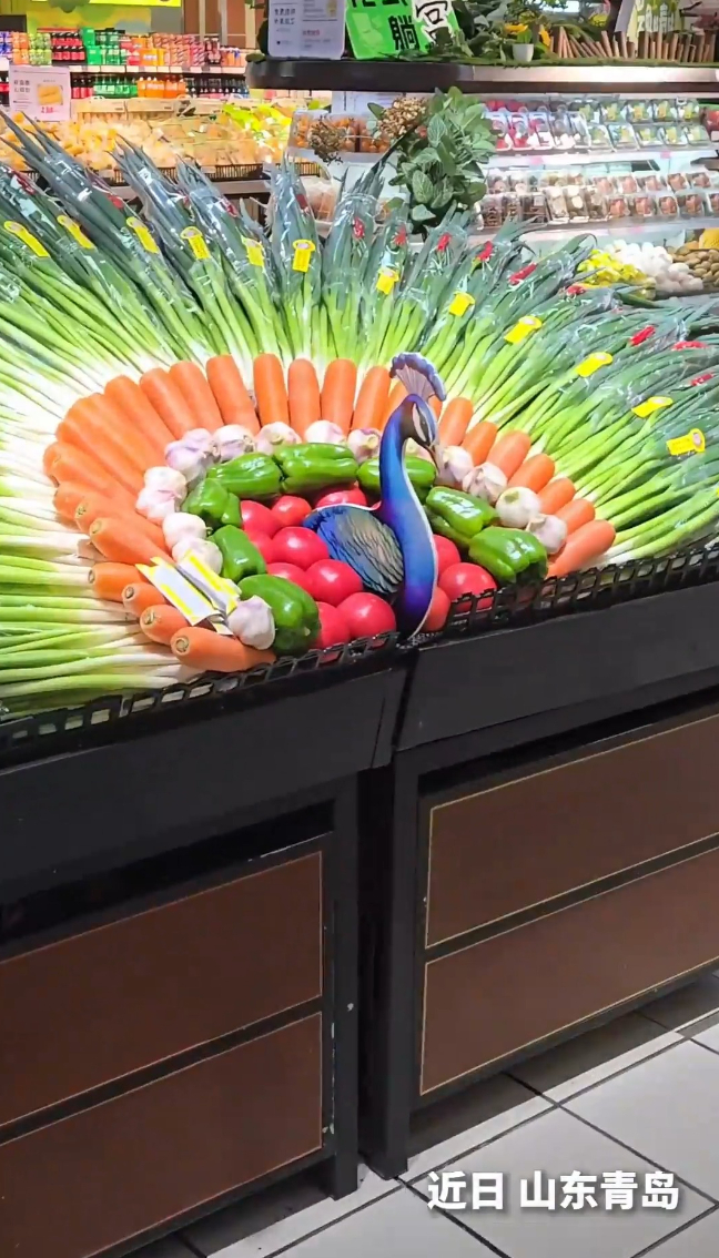 近日,山东青岛。镜头一转,超市菜摊变身“孔雀开屏”……网友:起猛了看见蔬菜开屏了。