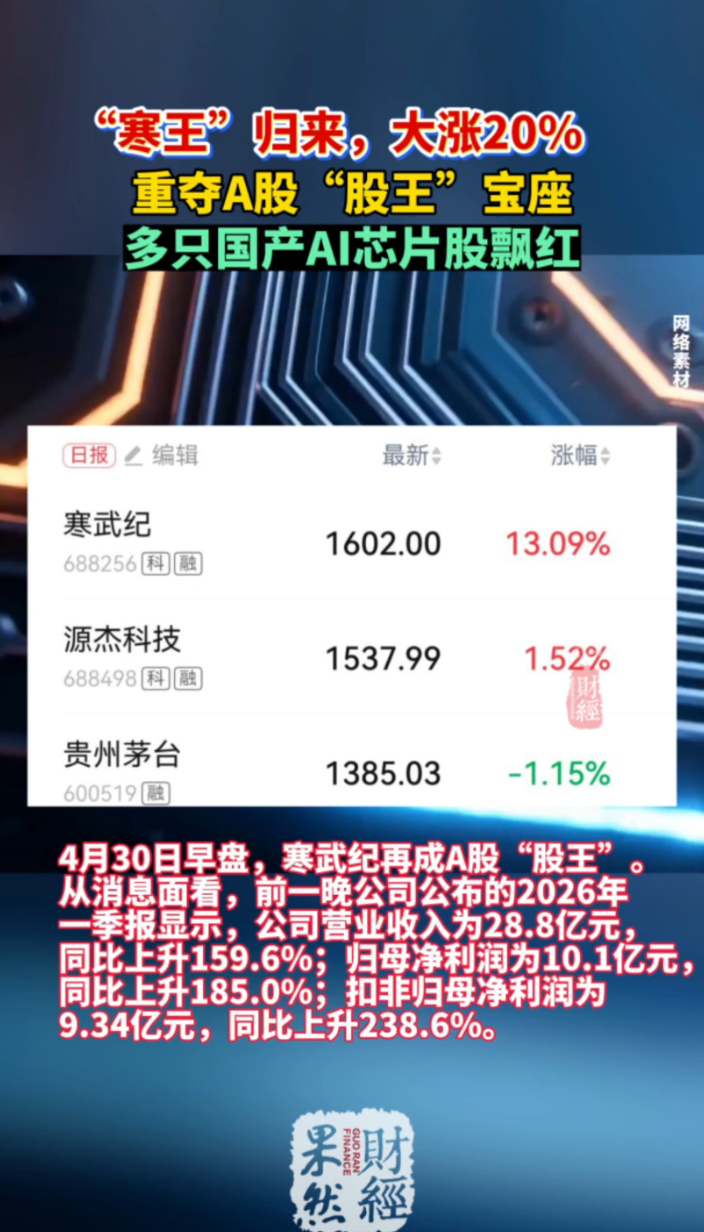 果然财经|寒武纪大涨20%,重夺“股王”宝座 16:05 原创齐鲁晚报·齐鲁壹点客户端 微信扫码扫码下载客户端寒武纪(688256)股价创历史新高,再次成为A股第一高价股。截至4月30日13:46,股价1699.96元,涨幅20%。4月29日晚,寒武纪发布的2026年一季报显示,公司第一财季业绩取得新突破。期内,营业收入达28.85亿元,同比增长159.56%,环比增长了52.65%,也是首次季度营收破20亿。