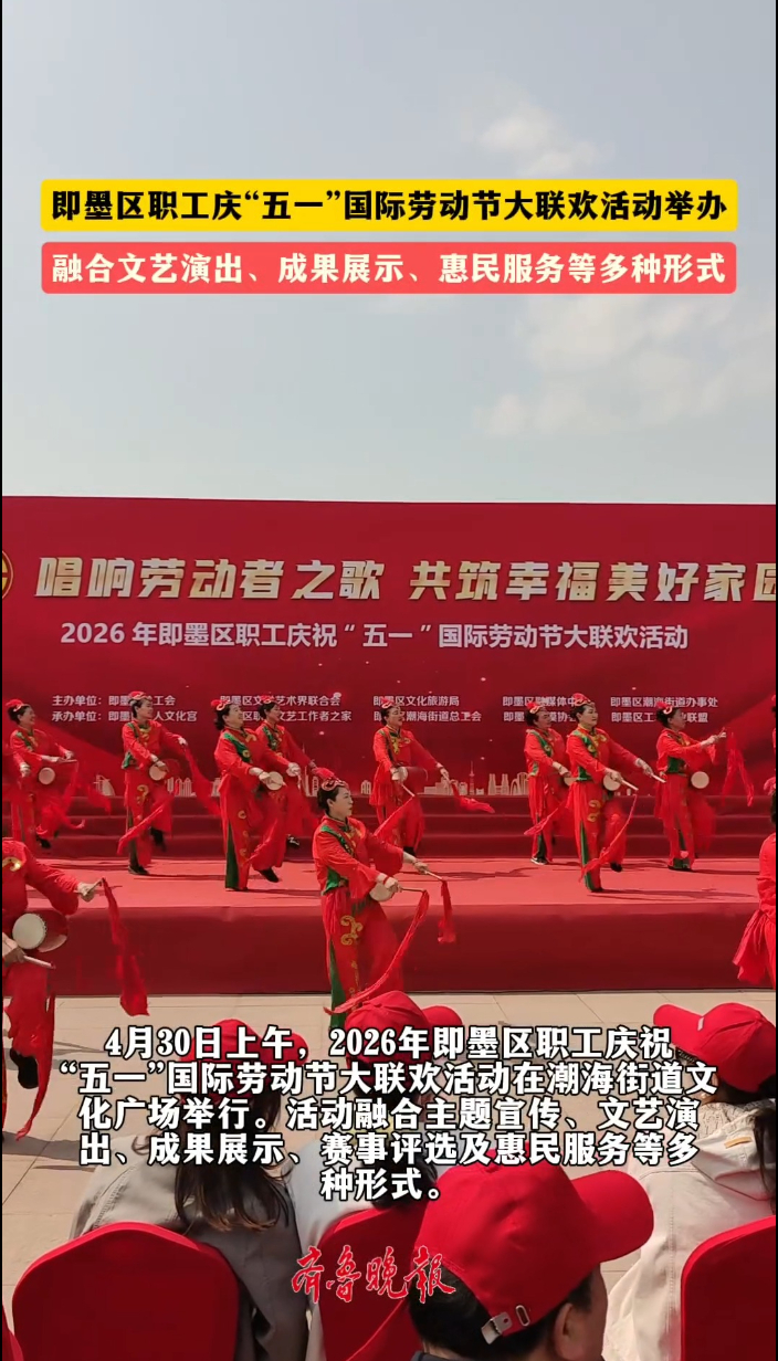 果然视频丨即墨区职工庆祝“五一”国际劳动节大联欢活动举行齐鲁晚报·齐鲁壹点客户端 17:20原创4月30日上午,2026年即墨区职工庆祝“五一”国际劳动节大联欢活动在潮海街道文化广场举行。活动融合主题宣传、文艺演出、成果展示、赛事评选及惠民服务等多种形式。(齐鲁晚报·齐鲁壹点 宋祖锋)